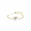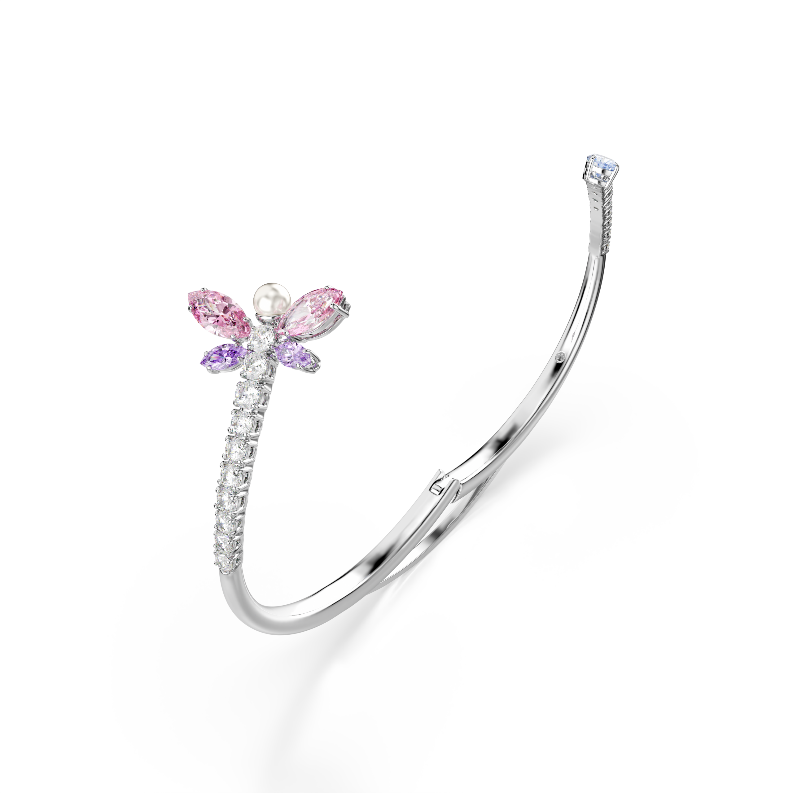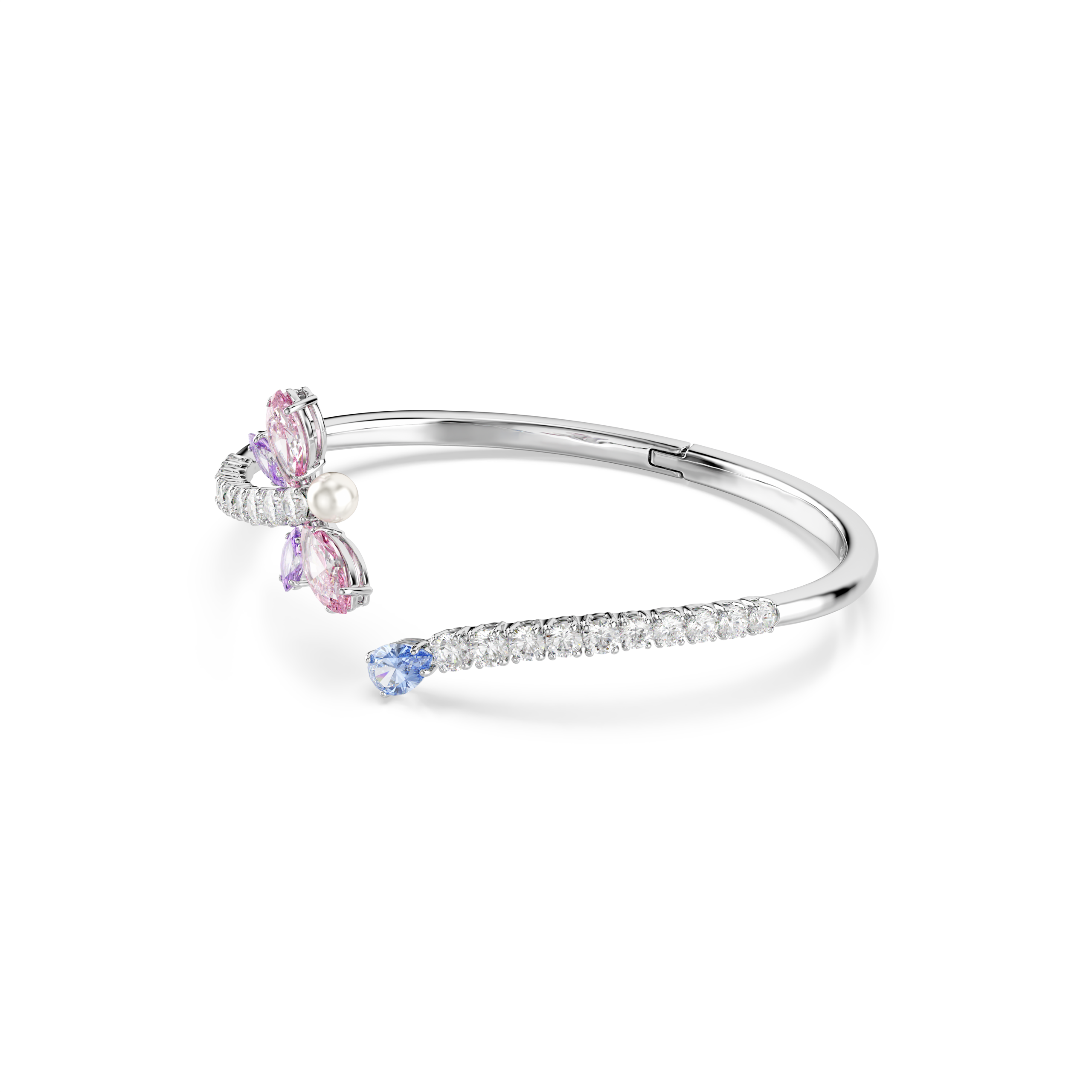Το χρώμα συναντά τη μαγεία σε αυτό το εμπνευσμένο από τη φύση άκαμπτο βραχιόλι. Διακοσμημένη με διαφανή Swarovski Zirconia pavé, η ανοιχτή βάση διαθέτει ένα μπλε Swarovski Zirconia σε κοπή pear στο ένα άκρο και ένα μοτίβο λιβελούλας στο άλλο, με ροζ και μοβ φτερά και ένα Swarovski Crystal Pearl. Αυτό το πολύχρωμο άκαμπτο βραχιόλι είναι φιλοτεχνημένο με επιμετάλλωση ροδίου, διαθέτει αρθρωτό κούμπωμα και μπορεί να φορεθεί μαζί με άλλα ασορτί κομμάτια από την ίδια οικογένεια με μοτίβο λιβελούλας.