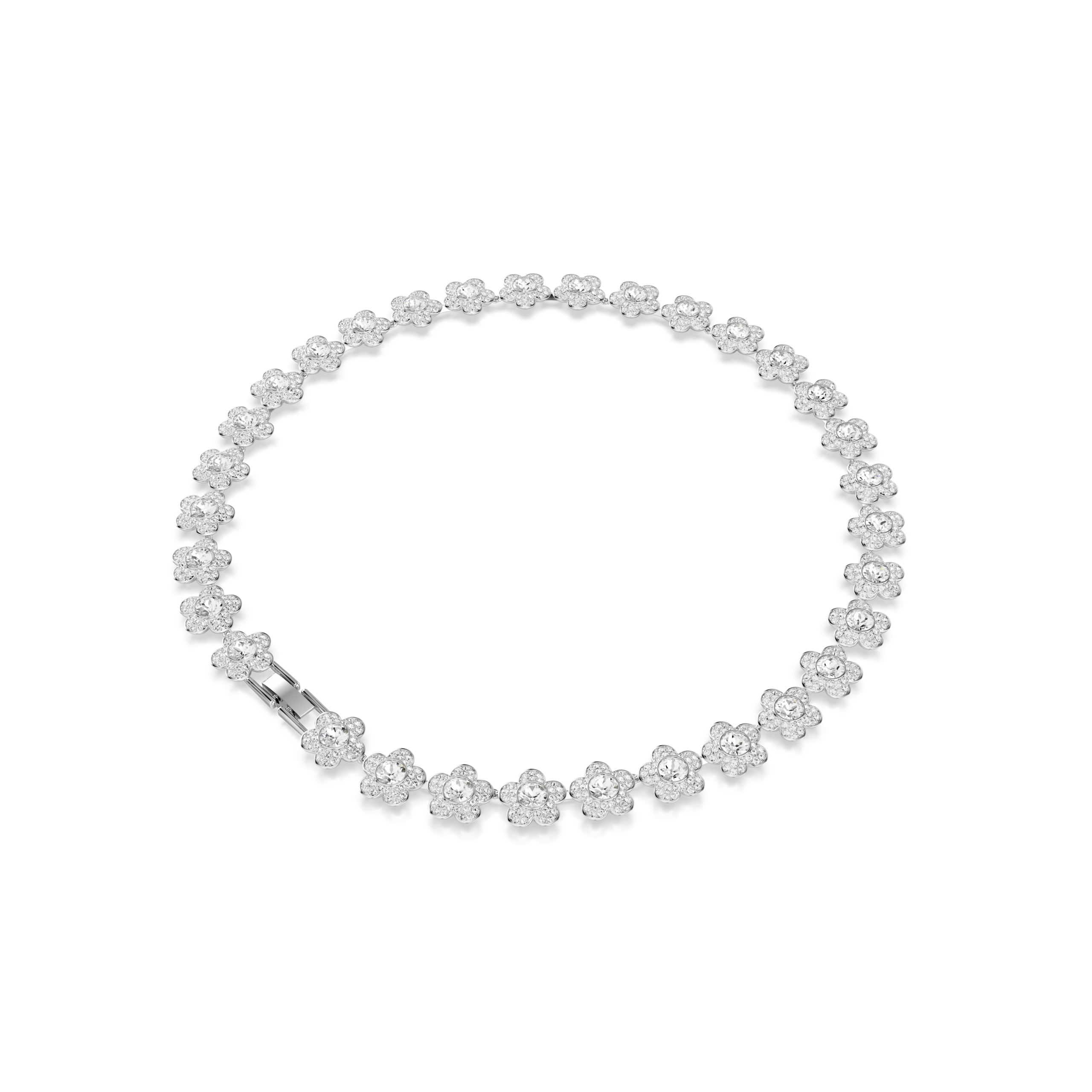 Ένα κολιέ που παραπέμπει στην ομορφιά της φύσης, αυτό το σχέδιο με επιμετάλλωση ροδίου διαθέτει μια all-around σειρά από ντελικάτα λουλούδια, καθένα από τα οποία έχει κέντρο από κρύσταλλο και πέταλα διακοσμημένα με αστραφτερό pavé