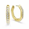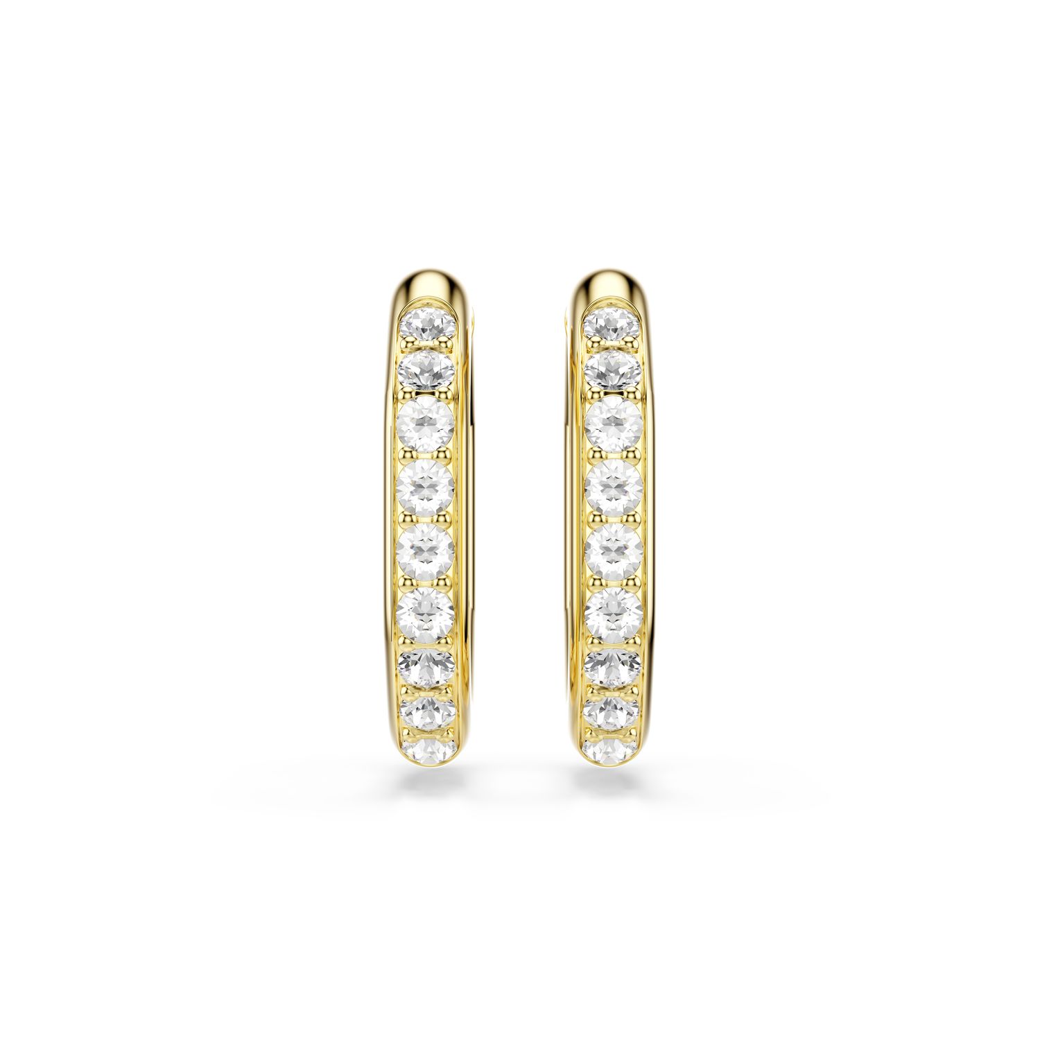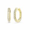 Εκφραστείτε και προκαλέστε εντύπωση με αυτά τα γεωμετρικά σκουλαρίκια κρίκους. Το λεπτό οκταγωνικό σχέδιό τους δημιουργεί ένα τολμηρό πλαίσιο για τη μία σειρά από διαφανή κρύσταλλα στρογγυλής κοπής, τα οποία είναι τοποθετημένα με λεπτεπίλεπτο οδοντωτό δέσιμο. Χάρη στον ειδικό μηχανισμό με πλακέτα με σούστα, τα σκουλαρίκια ανοίγουν και κλείνουν εύκολα, ενώ η επιμετάλλωση σε χρυσό τόνο είναι ιδανική για να τα συνδυάσετε με άλλα κομμάτια Dextera.