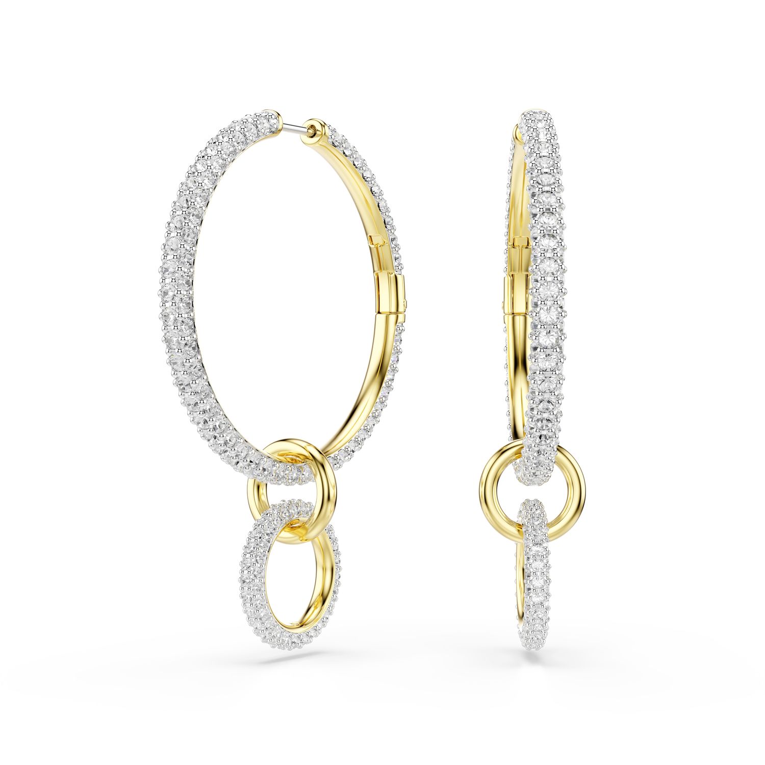 Απογειώστε τις καθημερινές σας εμφανίσεις με λάμψη, χάρη σε αυτά τα εκλεπτυσμένα σκουλαρίκια κρίκους. Φιλοτεχνημένο με τρεις αλληλοσυνδεόμενους κρίκους, κάθε σκουλαρίκι διαθέτει επιμετάλλωση σε χρυσό τόνο και είναι διακοσμημένο με λαμπερά διαφανή κρύσταλλα. Για ευελιξία στο styling, το κρεμαστό τμήμα μπορεί να αφαιρεθεί εύκολα, προσφέροντάς σας τη δυνατότητα να αλλάζετε την εμφάνισή τους με ευκολία.