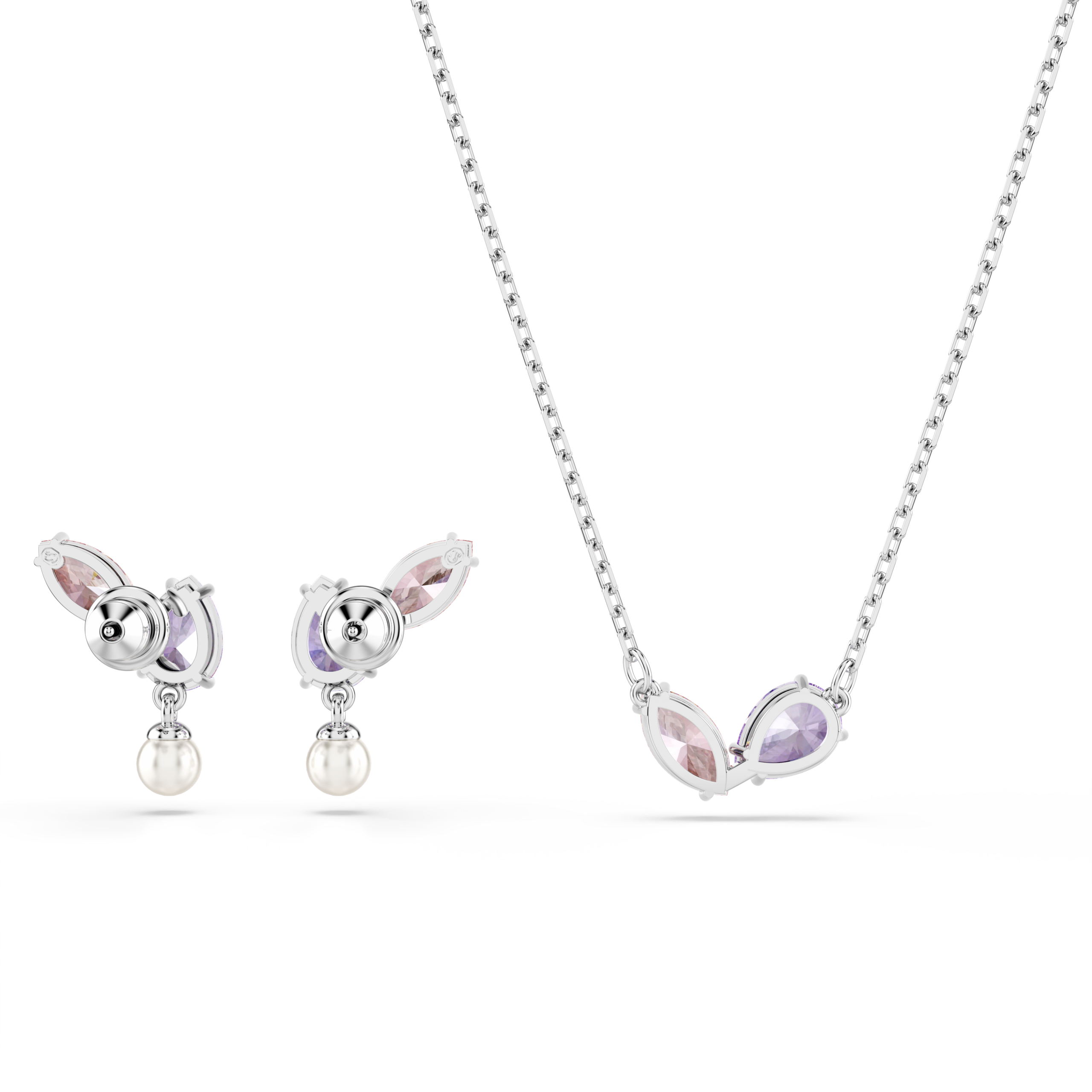 Δημιουργήστε ένα πολυεπίπεδο στυλ σε παστέλ αποχρώσεις με αυτό το πολύχρωμο σετ σκουλαρίκια και κολιέ. Κάθε κομμάτι με επιμετάλλωση ροδίου διαθέτει ροζ και μοβ Swarovski Zirconia σε διάφορες κοπές, ενώ τα σκουλαρίκια περιλαμβάνουν ένα κρεμαστό στοιχείο από Swarovski Crystal Pearls. Μια φωτεινή επιλογή για να προσδώσετε χαρά στο στυλ σας.