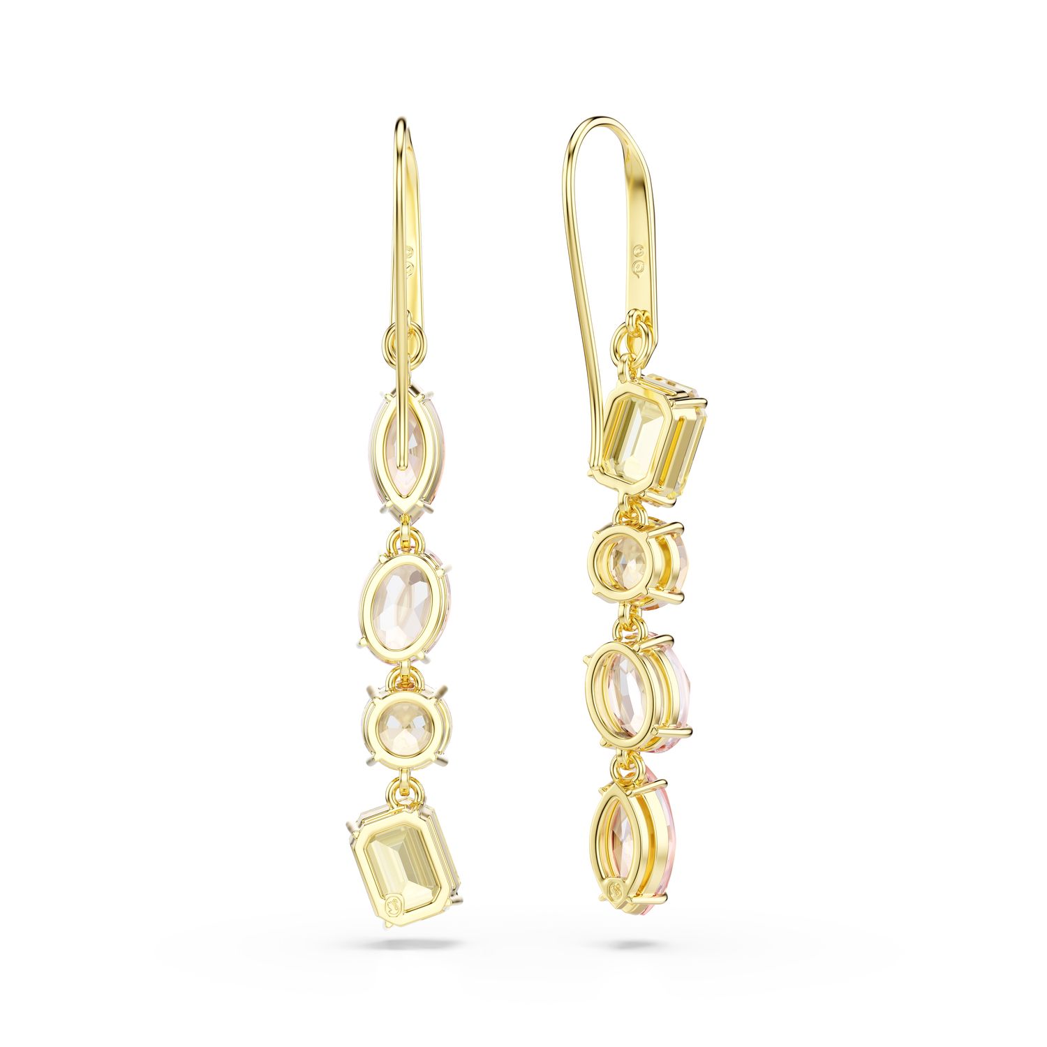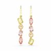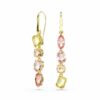 Οι απρόσμενοι σχηματισμοί αποτελούν το χαρακτηριστικό στυλ της οικογένειας Gema. Σε αυτά τα κρεμαστά σκουλαρίκια, το πνεύμα αυτό ζωντανεύει πανέμορφα μέσα από δύο πολύχρωμες σειρές με κρύσταλλα διαφορετικών σχημάτων. Το ασύμμετρο ζευγάρι διαθέτει διάφορες αποχρώσεις του κίτρινου και του ροζ, τοποθετημένες με επιμετάλλωση σε χρυσό τόνο για ζεστό και λαμπερό αποτέλεσμα.