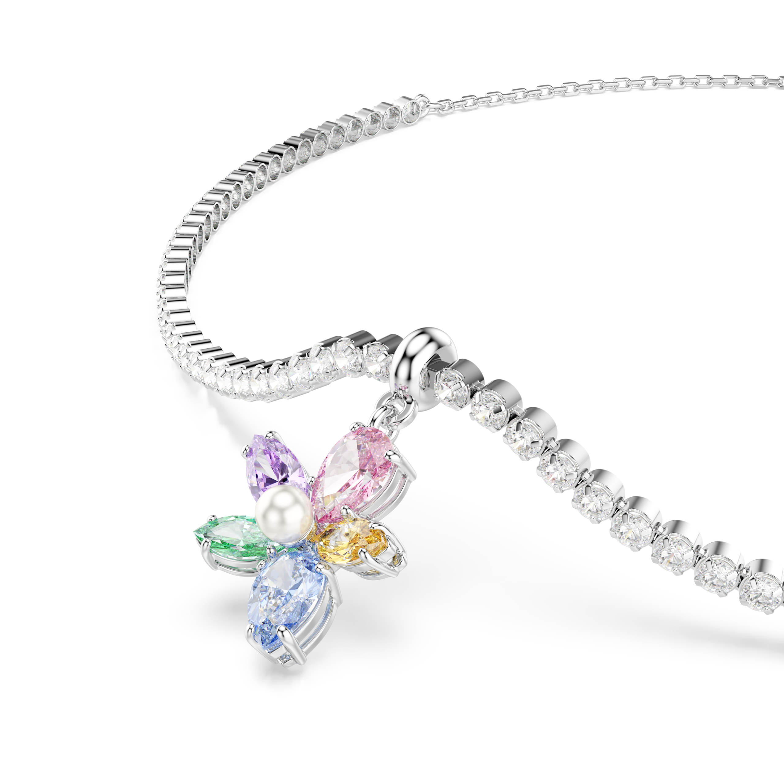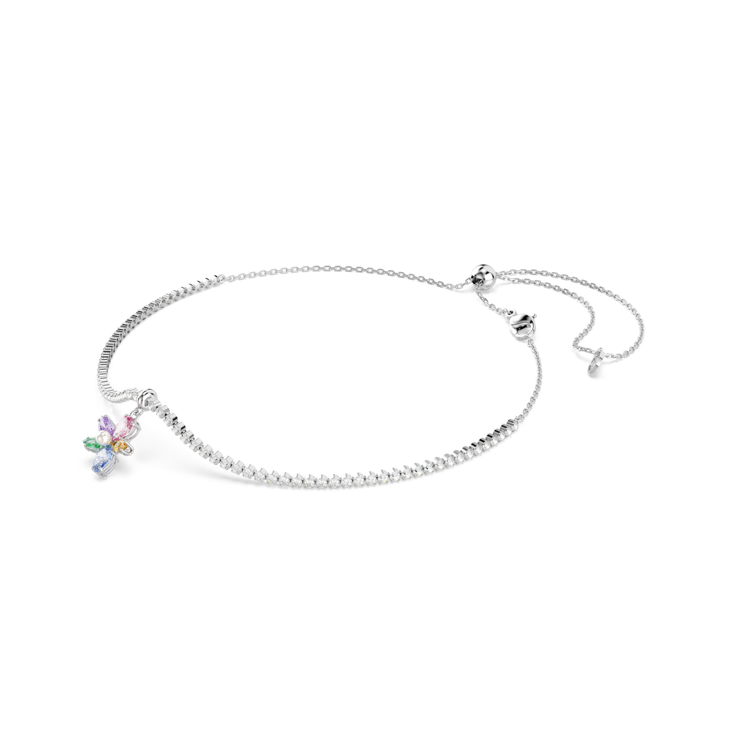 Μια ζωντανή πινελιά διαχρονικότητας της φύσης, αυτό το τσόκερ με επιμετάλλωση ροδίου διαθέτει ένα κεντρικό μοτίβο αγριολούλουδου, που σχηματίζεται από πέντε Swarovski Zirconia σε διάφορες κοπές και αποχρώσεις. Ένα Swarovski Crystal Pearl είναι τοποθετημένη στο κέντρο, ενώ διαφανή Swarovski Zirconia αγκαλιάζουν τον λαιμό σε μια ντελικάτη αλυσίδα με υποδοχές. Προσαρμόστε το συρόμενο κούμπωμα για να εφαρμόσει το τσόκερ στο μέγεθός σας και φορέστε το μαζί με το ασορτί βραχιόλι.