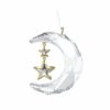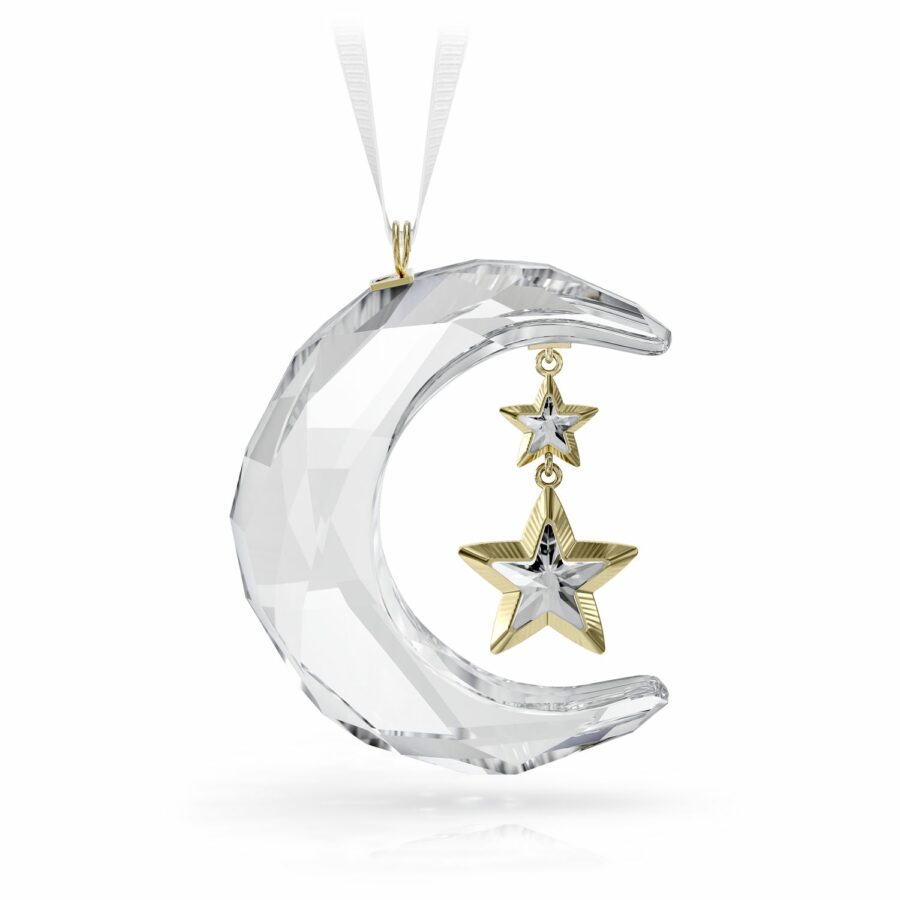 Με πηγή έμπνευσης τον έναστρο ουρανό, αυτό το μεγαλοπρεπές στολίδι θα προσθέσει μια ουράνια πινελιά σε κάθε γιορτινή διακόσμηση. Με 200 λαμπερές έδρες, το αστραφτερό σχέδιο περιλαμβάνει ένα μισοφέγγαρο με δυο κρεμαστά αστέρια σε δέσιμο σε σαμπανί χρυσό τόνο. Ολόκληρο το σύνολο είναι περασμένο σε πολυτελή λευκή γκρο κορδέλα. Κρεμάστε το σπίτι σας και κάντε μια ευχή για τη νέα χρονιά. Διακοσμητικό αντικείμενο. Δεν είναι παιχνίδι. Δεν είναι κατάλληλο για παιδιά κάτω των 15 ετών.